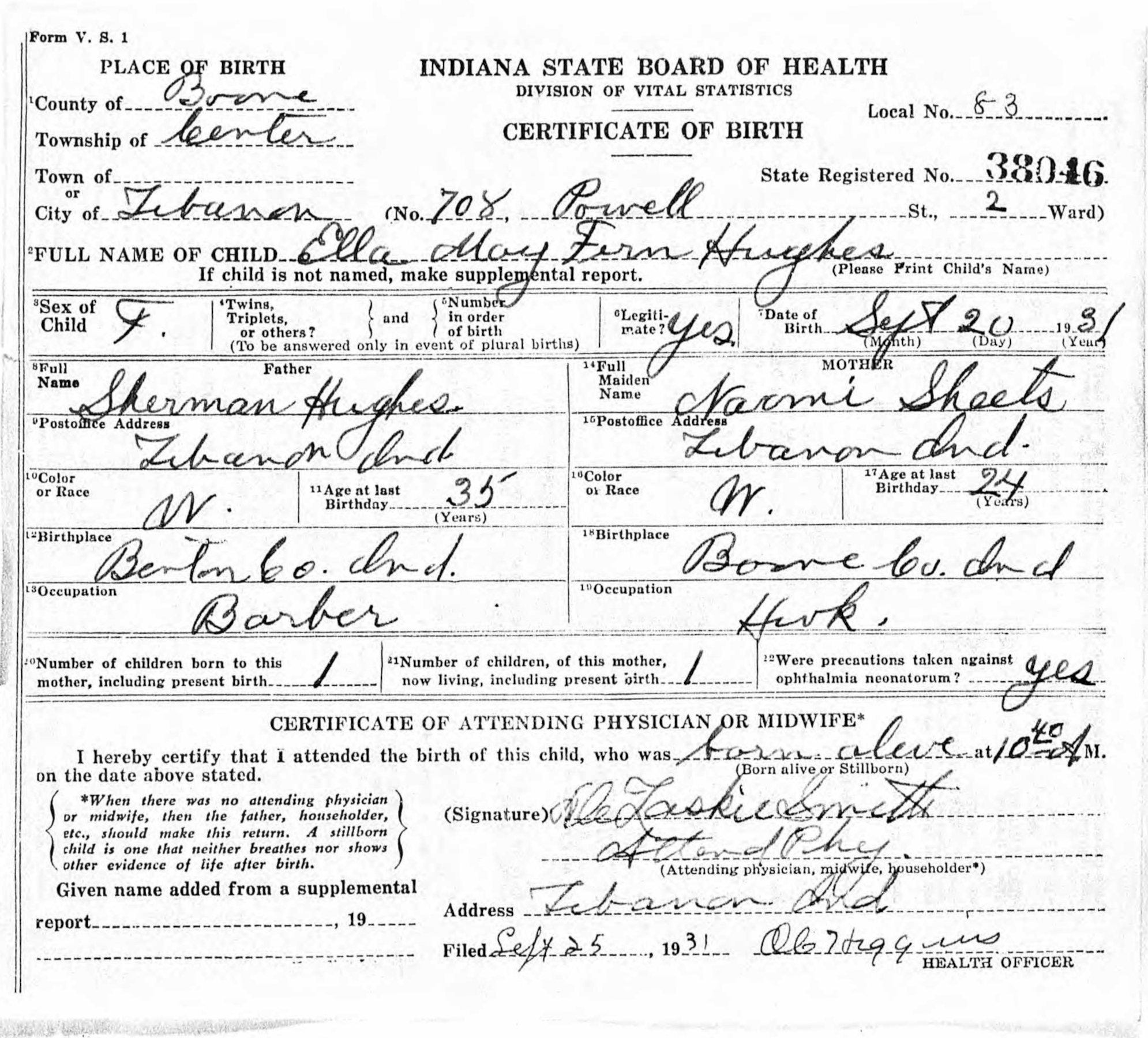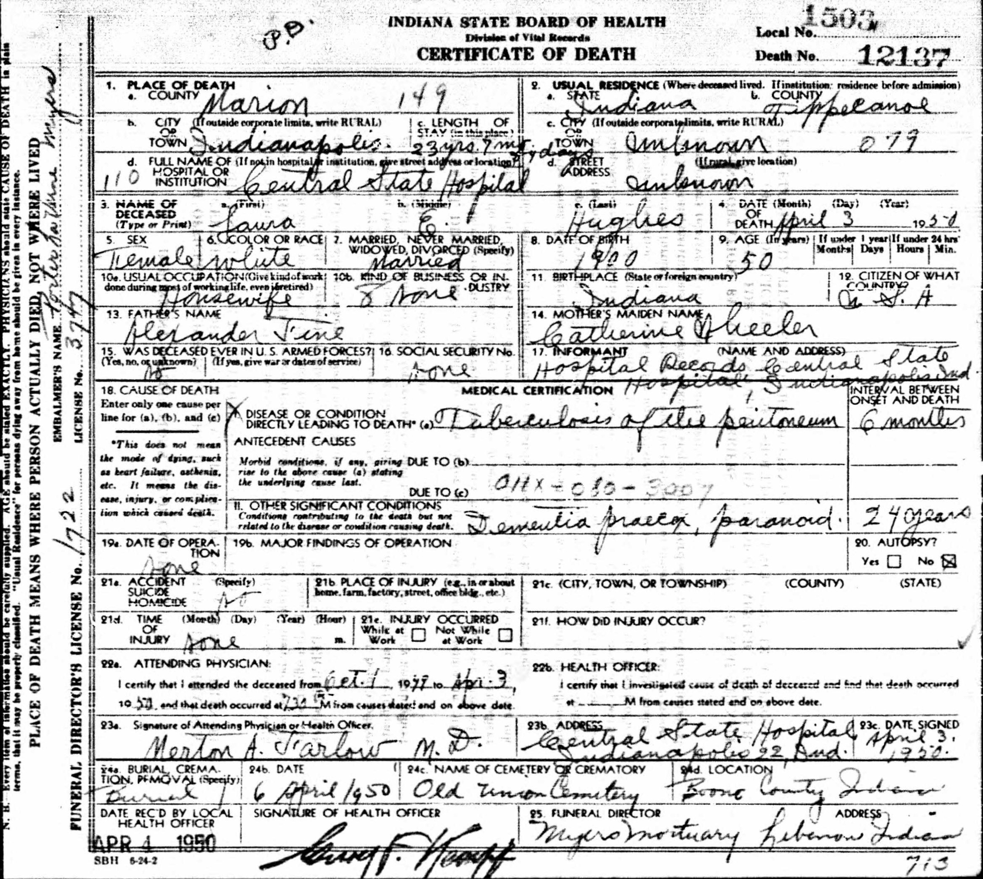 So it turns out, my great-grandfather, "Sherman" (Davis Sherman Hughes), was officially a bigamist. My great-grandmother's death certificate that was issued from the central hospital (first image below) has her married to him (still) but he had a daughter in high school with his wife, Naomi F. Sheets, when my great-grandmother passed away in 1950.