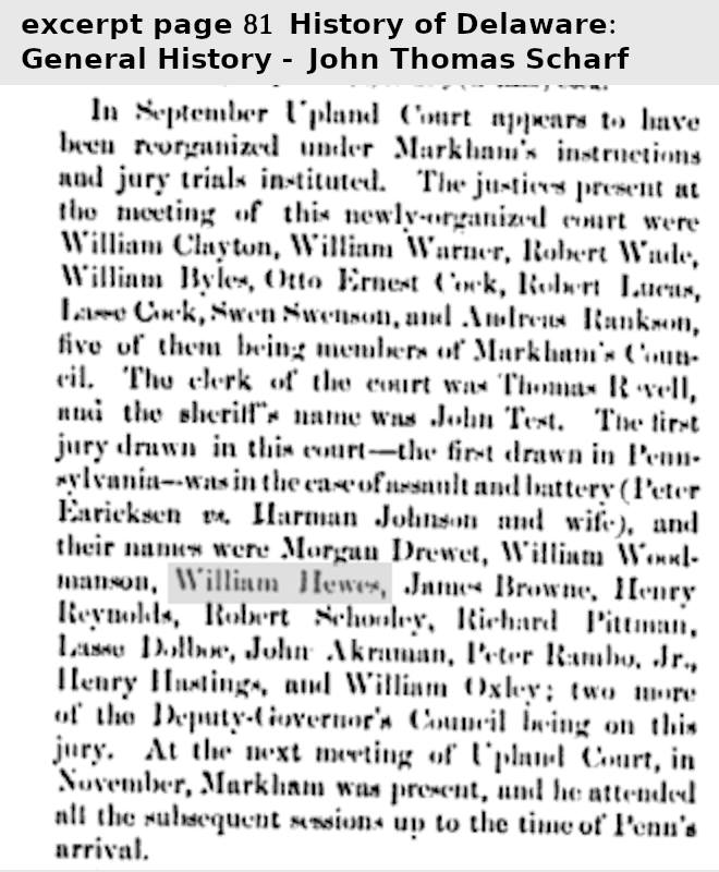 where William Parsons Hewes, my great(x7) grandfather (& grandfather to Lt Jonathan Hughes), is listed as one of the jurors that was called (by William Penn) to serve on the first jury convened for a criminal trial in Colonial America.